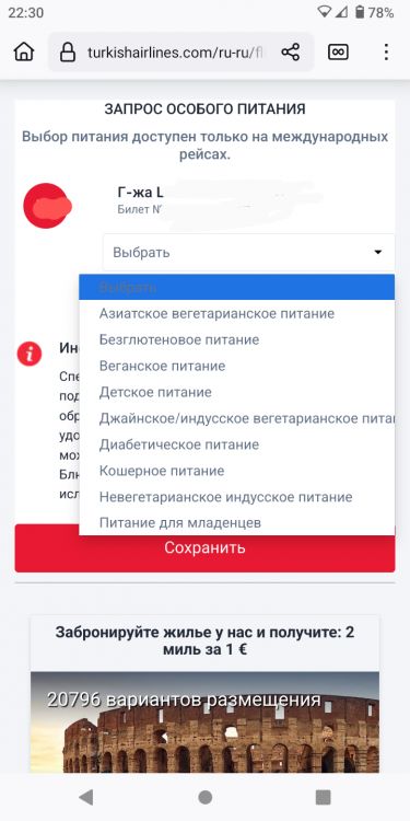 Если летишь Turkishairlines, то по коду бронирования или номеру электронного билета, не позднее, чем за 24 часа до вылета, можно выбрать питание на борту, в том числе детское